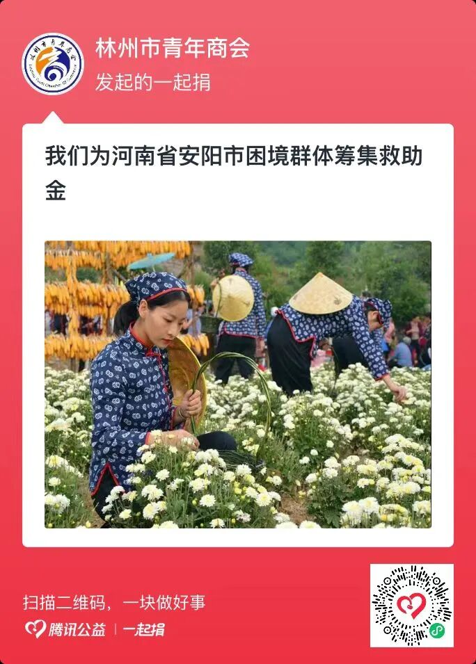 为此,林州青年商会特向全体会员和社会各界人士发出倡议:集小善、成大爱,本着依法自愿、鼓励奉献的原则,积极参与腾讯“99公益日”活动,奉献爱心。共同奉献爱心,用爱心关怀乡村振兴,用真情温暖点燃希望的灯!期待您将本次腾讯“99公益日”活动的信息,通过微信、抖音、视频号等渠道转发给身边的同事、朋友,让更多的爱心人士一起参与活动,我们衷心感谢您的支持!